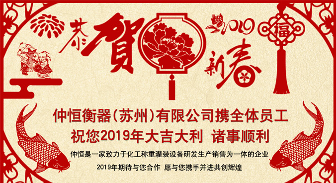 仲恒衡器(蘇州)有限公司攜全體員工祝您2019年大吉大利諸事順利,仲恒是一家致力于化工稱重灌裝設備研發(fā)生產(chǎn)銷售為一體的企業(yè),2019年期待與您合作,愿與您攜手并進共創(chuàng)輝...