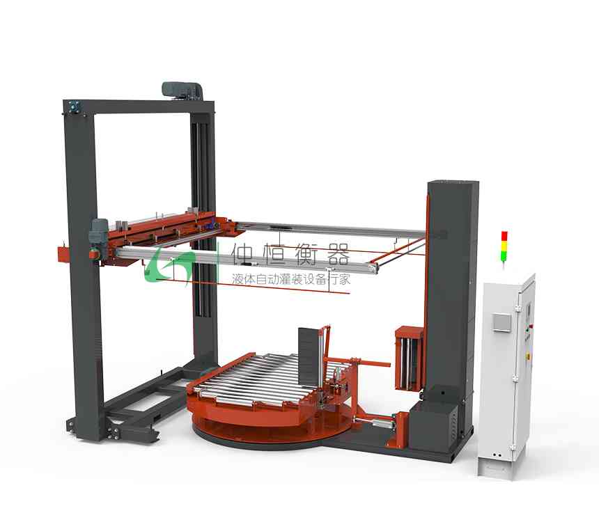 本機是灌裝線配套的在線纏繞覆頂膜一體機,采用PLC可編程控制和觸摸屏操作。用戶可自定義纏繞層數、是否覆頂膜和加固層數等功能。當前端托盤輸送至轉盤上后,系統會自動進行旋轉纏繞和覆頂膜操作。設備具有故障檢測、缺膜警示報警等功能,智能防呆,自動化程度高。