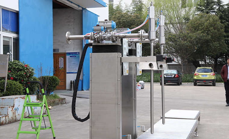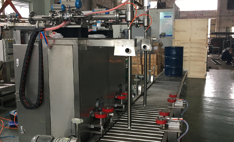 此款200L自動灌裝生產線,包裝桶輸送到灌槍底部,自動尋口,自動定量灌裝,灌槍隨液面上升自動上升,灌裝完成自動輸送至暫存區,全程無人值守,在確保灌裝精度的同時確保灌...
